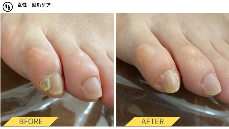爪やすりで整え、保湿剤を塗布して皮膚を保護します。足爪周りの角質ケアも丁寧に行います。